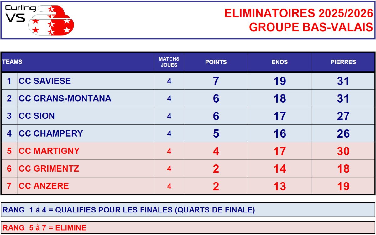 Au classement le CC SAVIESE est en tête avec 9 points = qualifié pour les quarts de finale. Les savièsans sont suivi au classement du CC SION avec 8 points, 3ème le CC CHAMPERY avec 7 points (assurée de jouer les quarts de finales, grâce au match de repos lors du dernier tour) et à la 4ème place, le CC CRANS-MOTANA avec 6 points, 2 points d’avance sur le 5ème et le 6ème …