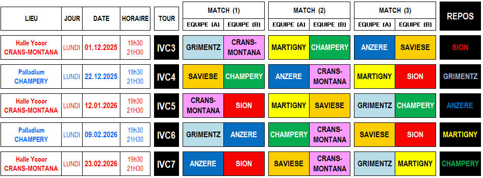 Prochain tour (3ème tour), le lundi 01.12.2025, à la Hale d’Ycoor à Crans-Montana.