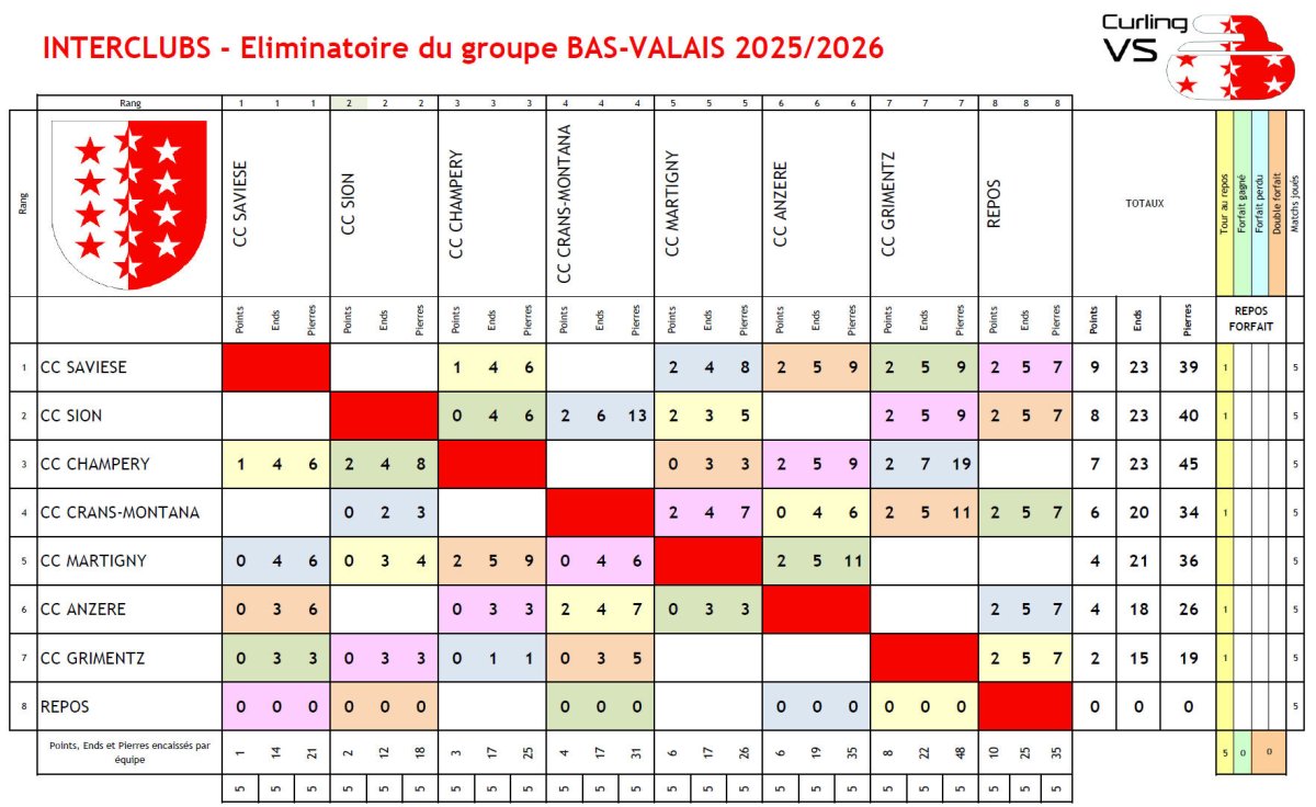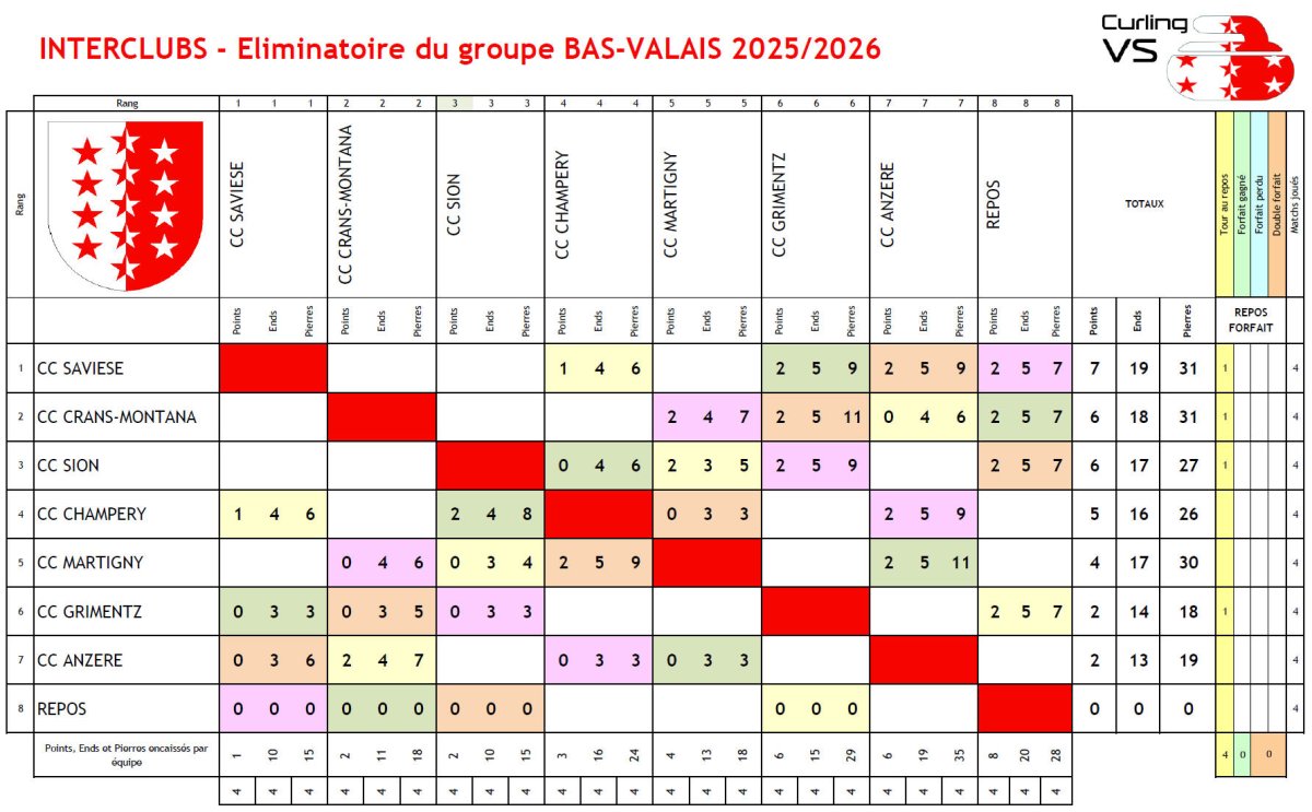 Au classement le CC SAVIESE est en tête avec 7 points, suivi du CC CRANS-MONTANA et du CC SION avec 6 points, à la 4ème place, le CC CHAMPERY avec 4 points.
